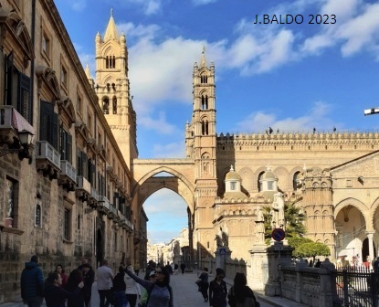 Al cap d’uns metres, al costat esquerra veureu la Piazza Bologni, perfectament quadrada, i presidida per una estàtua de bronze del emperador Carles V de 1566, i flanquejada per dos palaus; una mica mes enllà, veureu la Chiesa del Santissimo Salvatore, del 1682 en barroc sicilià; i desprès veureu el Palazzo Castrone Santa Ninfa, del segle XVI i estil renaixentista, amb el portal barroc i un bonic pati interior; finalment arribareu als jardins davant la Catedral, amb una barreja d’estils, doncs, inicialment, al segle VI, va ser una basílica amb estil romà d’orient, amb la dominació musulmana va passar a mesquita, i al segle XII, amb l’arribada dels normands, es comença la catedral en estil àrab (fatimita)i normand, passant per el gòtic i el classicisme.